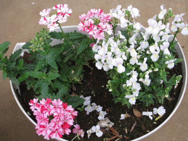 写真は、一月ほど前から看板の所に飾っているネメシアメロウとバーベナ。知らなかったのですが、バーベナっていろんな種類がありますね