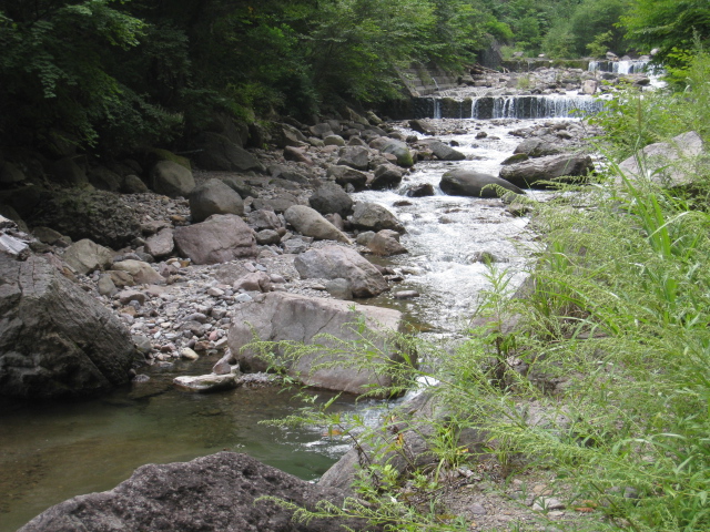 女夫渕温泉から写真のような渓流沿いの遊歩道を歩くこと約60分で八丁の湯に到着です。