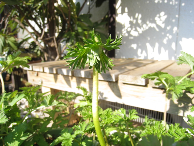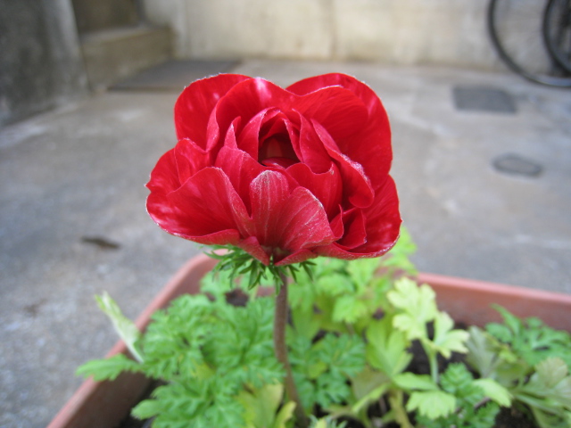 初秋に球根から植えたアネモネはこんなになっています。片方は花芽が高く伸びる高生の菊咲き。