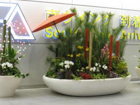 写真は、成田空港に飾ってあった花々。和のイメージがよく出ていて外人さんが嬉しいそうに花の前で写真をとっていました。
