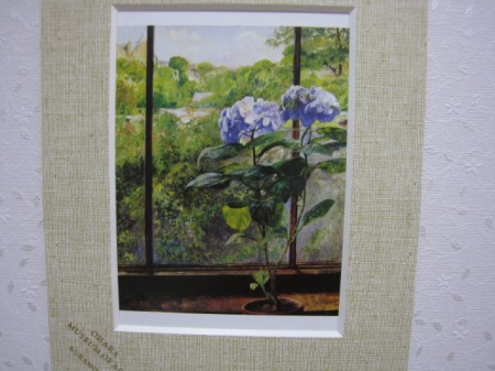 レオン・フレデリックの『花』です。何の花を描いたのか正確なことはわかりませんが、絵を見る限りアジサイのように見えますので、今の時期に飾りました。
