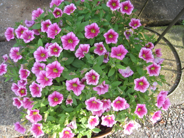 鉢いっぱいに成長したペチュニア・ギュギュ。4月中旬に三号ポット一つを購入して、10号鉢に植えていた所株いっぱいに広がってくれました。摘心をしないでもまとまって成長するとのことなので、試しに一度も摘心しないで育ててみましたが、写真のようにきちんと締まって株全体に花を咲かせています。成長過程では途中、株の型が乱れることもありましたが、徐々に鉢の大きさに合わせてまとまっていきました。花柄摘みもあまり手がかからないし、雨にも比較的に強い感じで手のかからない初心者向きの逸品です。
