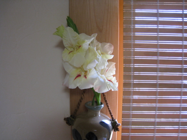 次のグラジオラスが咲きました。今度のは中央がうっすらと赤い幾分か小輪のものです。一鉢に4個植えていましたが、ひと株しか花芽が上がってこないので今度は切花で飾っています。