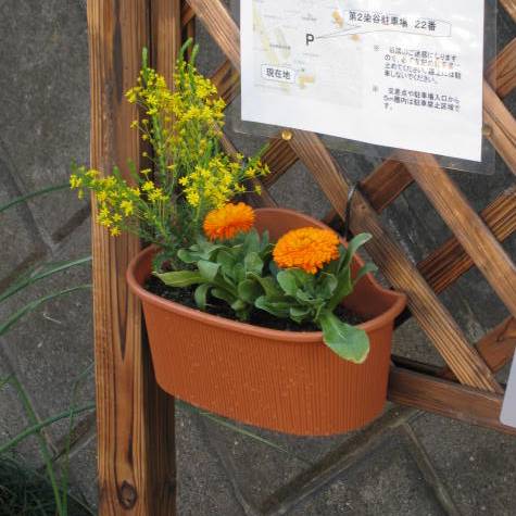看板の所にも、少しだけ寄せ植えをしました。キンセンカ(花言葉:乙女の美しい姿、別れの悲しみ、慈愛)とゴールデンクラッカー(花言葉:心踊る、祝福、美しい日々)