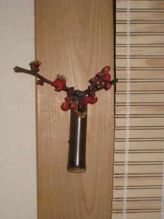 ベットサイドの一輪挿しには、庭に咲いていたボケの花。
