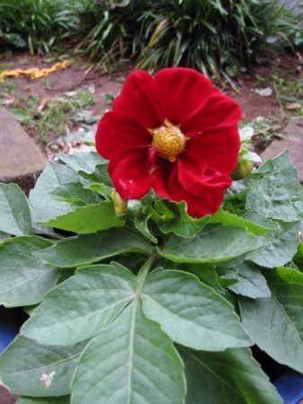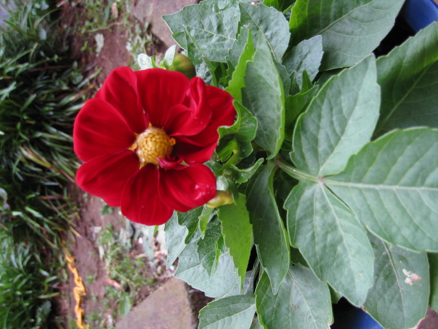 ようやくダリアに花が咲きましたつぼみが白かったので白い花だとばかり思っていましたが、咲いてみたら赤でした。予想以上に丈が低くかわいらしいダリアです。