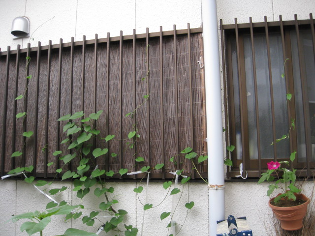 まだ、こんな感じです。。昼過ぎからしか日差しの当たらない場所なので生育が悪いのでしょうかね。それでもトイレはすごく暑くなるので、目隠しもかねて、よしずもかけています。