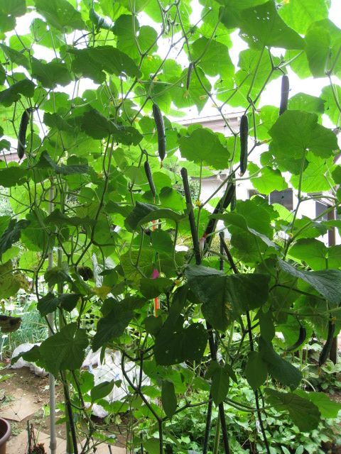 キュウリは、病気にかかり易く、葉がどんどん病気で枯れていきがちですが、今年植えたのは接ぎ木されているキュウリです。病気に強く、分枝しやすく、実もたくさんなると書いてありましたが、本当に良く茂り、食べきれないほど実をつけてくれています。![]()