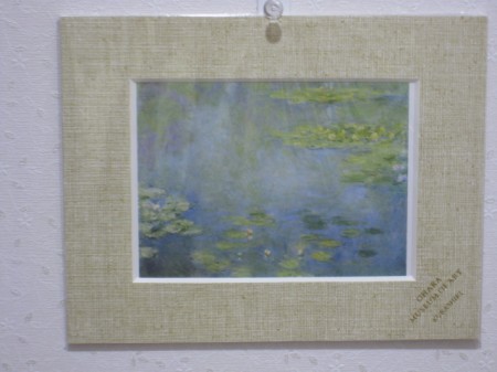 写真は、クロード・モネの睡蓮。大原美術館の売店で絵葉書を購入し、トイレ内に飾りました。他にも購入しましたので、時々、絵が変わります。お楽しみに。