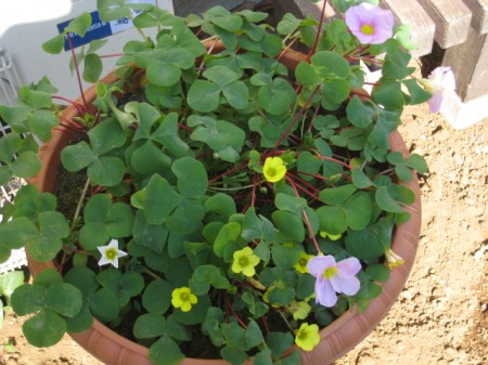 オキザリスといってもたくさん品種がありますが、今回植えたのは冬に咲く様々な品種をミックスしたものです。早速、様々な形の黄色、白、紫の三色が咲き始めました。