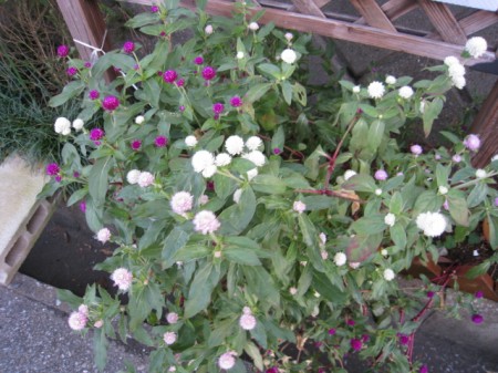 看板の所に茂っている千日紅の花を切り